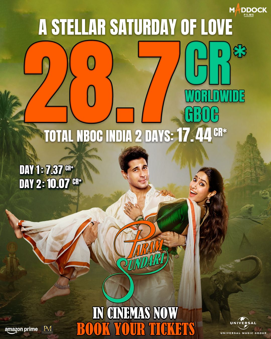Dinesh Vijan’s Maddock Films’ Param Sundari is off to a strong start at the box office, recording impressive growth over its first two days. After a solid opening day of ₹7.37 cr on Friday, the film jumped by 36.64% on Saturday with collections of ₹10.07 cr, taking the total to ₹17.44 cr & 28.7cr worldwide GBOC.