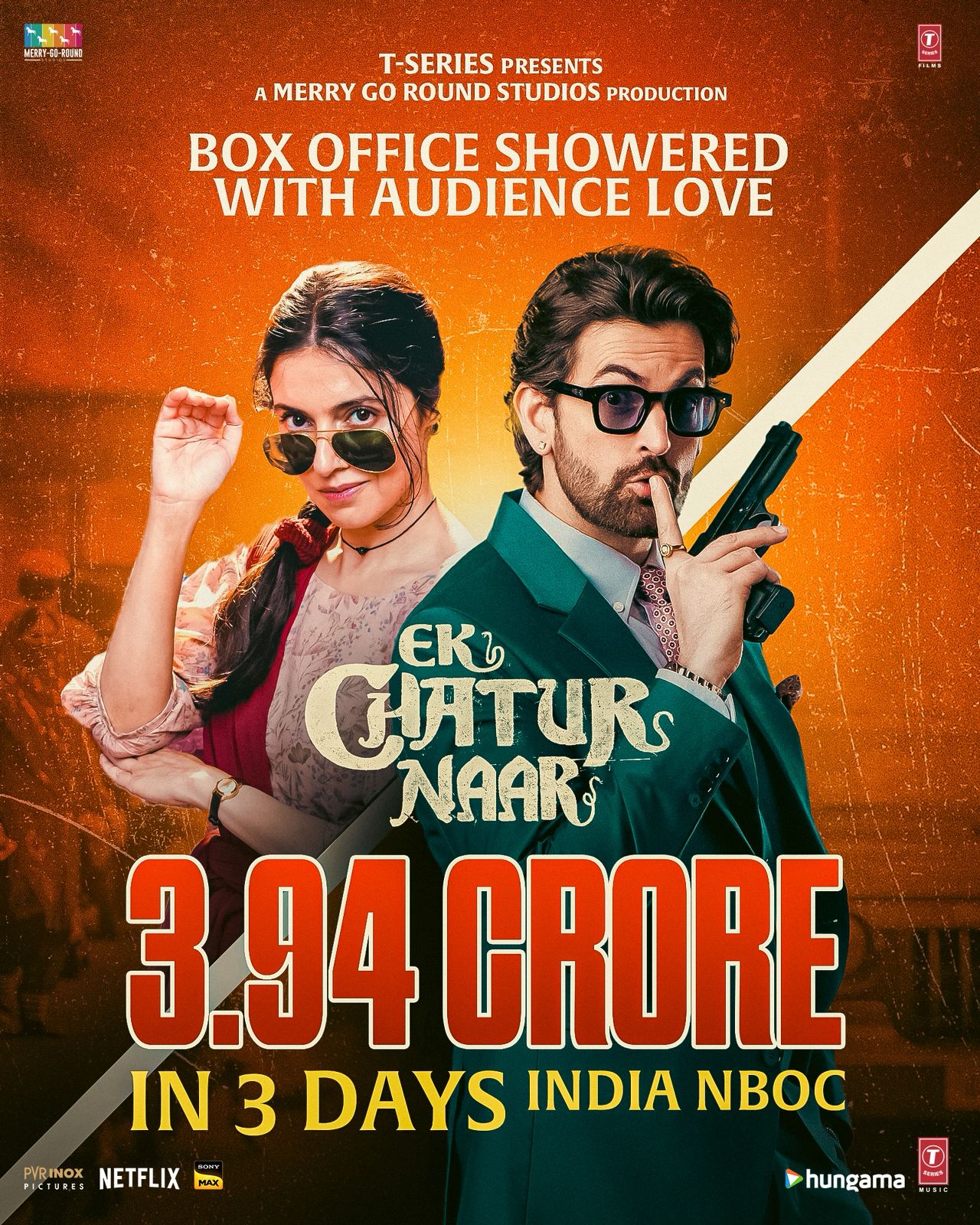 Presented by T-Series and produced by Umesh Shukla, Ashish Wagh, and Zeeshan Ahmad under the banner of Merry Go Round Studios, Ek Chatur Naar continues its run in cinemas across India.