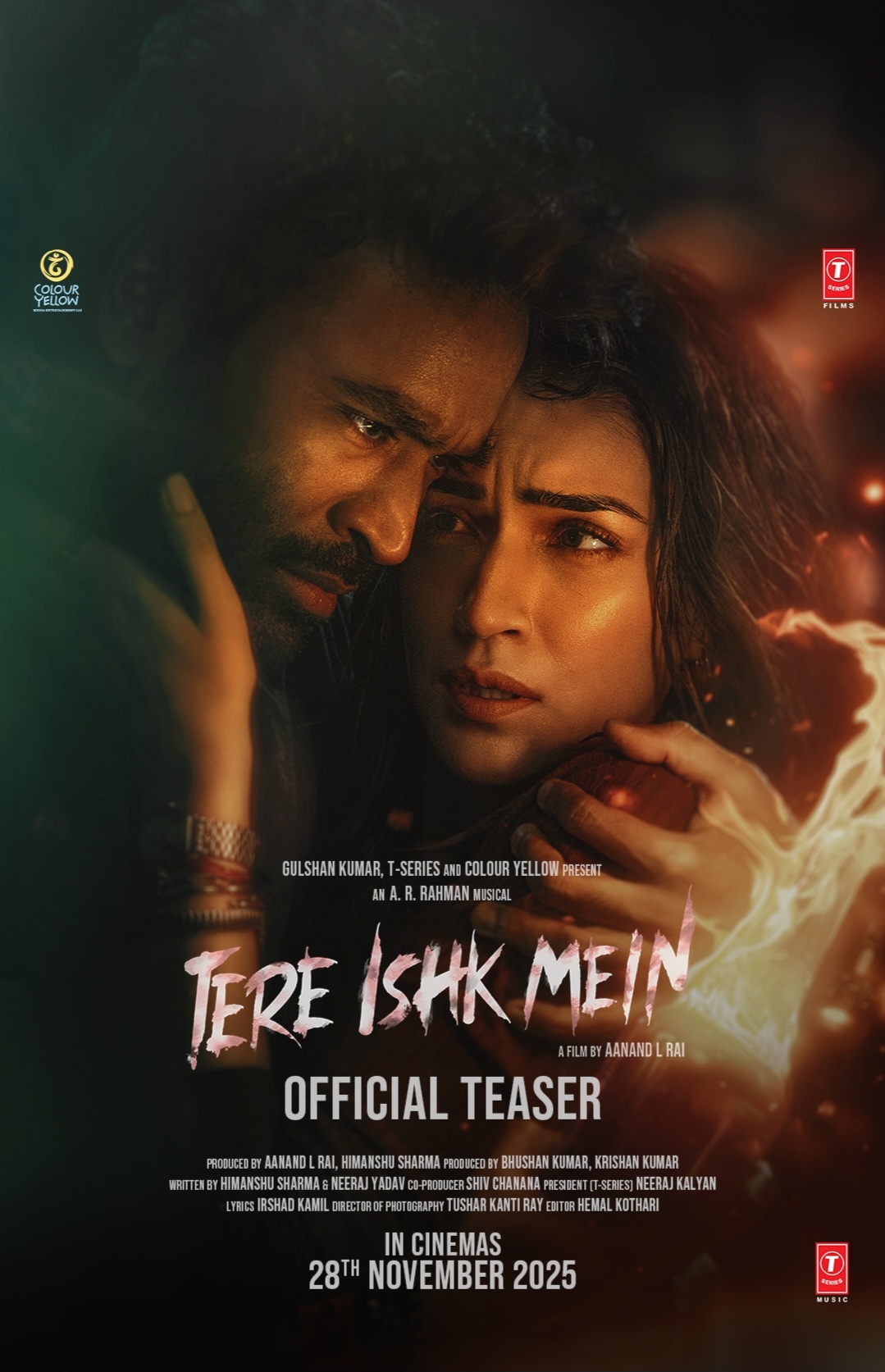 Gulshan Kumar, T-Series, and Colour Yellow present ‘Tere Ishk Mein’, produced by Aanand L Rai and Himanshu Sharma, produced by Bhushan Kumar and Krishan Kumar. The film directed by Aanand L Rai and written by Himanshu Sharma and Neeraj Yadav, is an A.R. Rahman musical with lyrics by Irshad Kamil. Starring Dhanush and Kriti Sanon, the film is scheduled to release worldwide in Hindi and Tamil on 28th November 2025.