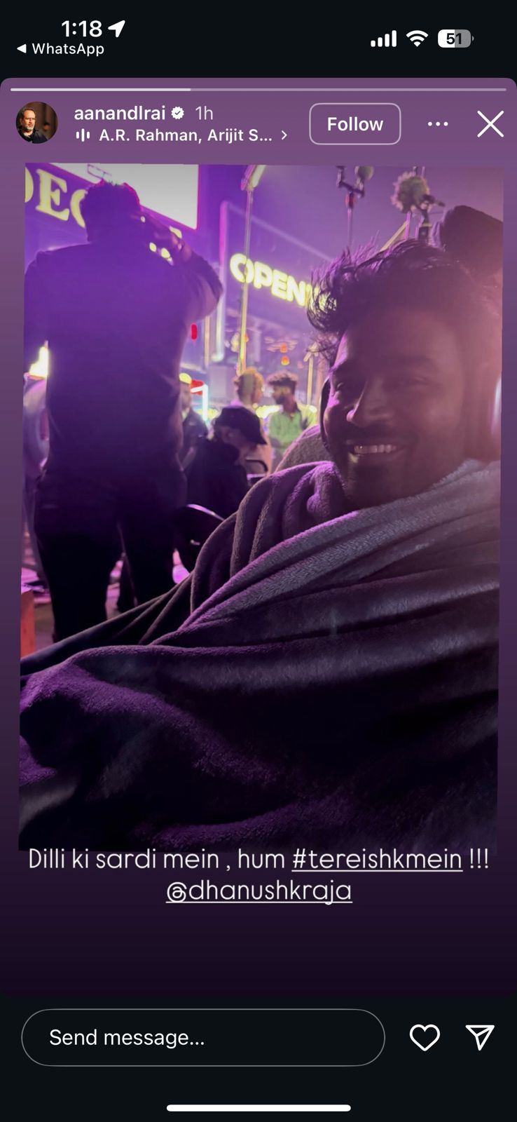 Director Aanand L Rai recently shared a candid behind-the-scenes photograph of Dhanush from the sets of their upcoming film Tere Ishk Mein. Captured during an outdoor shoot in the biting cold of Delhi winter, the image features Dhanush seated on a chair wrapped in a cozy blanket, flashing a warm smile at the camera. The Instagram story was captioned “Dilli ki sardi mein, hum #TereIshkMein” The simple yet endearing moment has resonated with fans, offering a peek into the world of Tere Ishk Mein.
