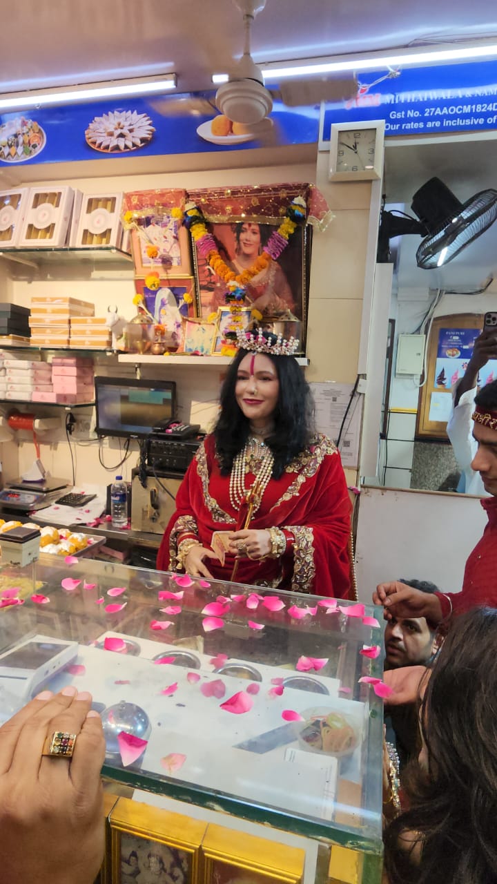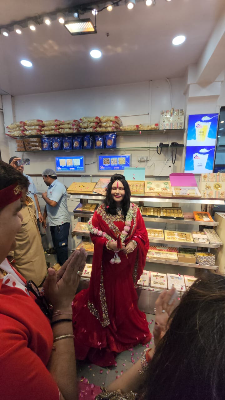 Her visit brought immense happiness to devotees and visitors gathered to seek her blessings. As her holy footsteps entered MM Mithaiwala, the entire place resonated with chants and devotion, marking a truly spiritual beginning to the festival of lights.
