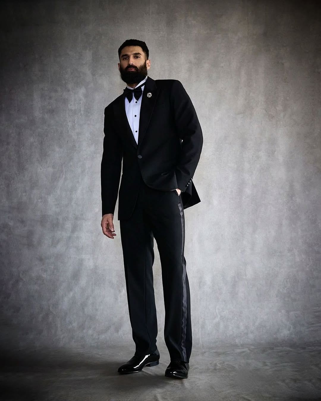 Aditya Roy Kapur brings in a sturdy and larger-than-life appeal in a classic black suit with a satin vertical patch along his pants. He maintains the standards of classic clothing by pairing his suit with a spherical brooch, a bow and glossy black shoes.