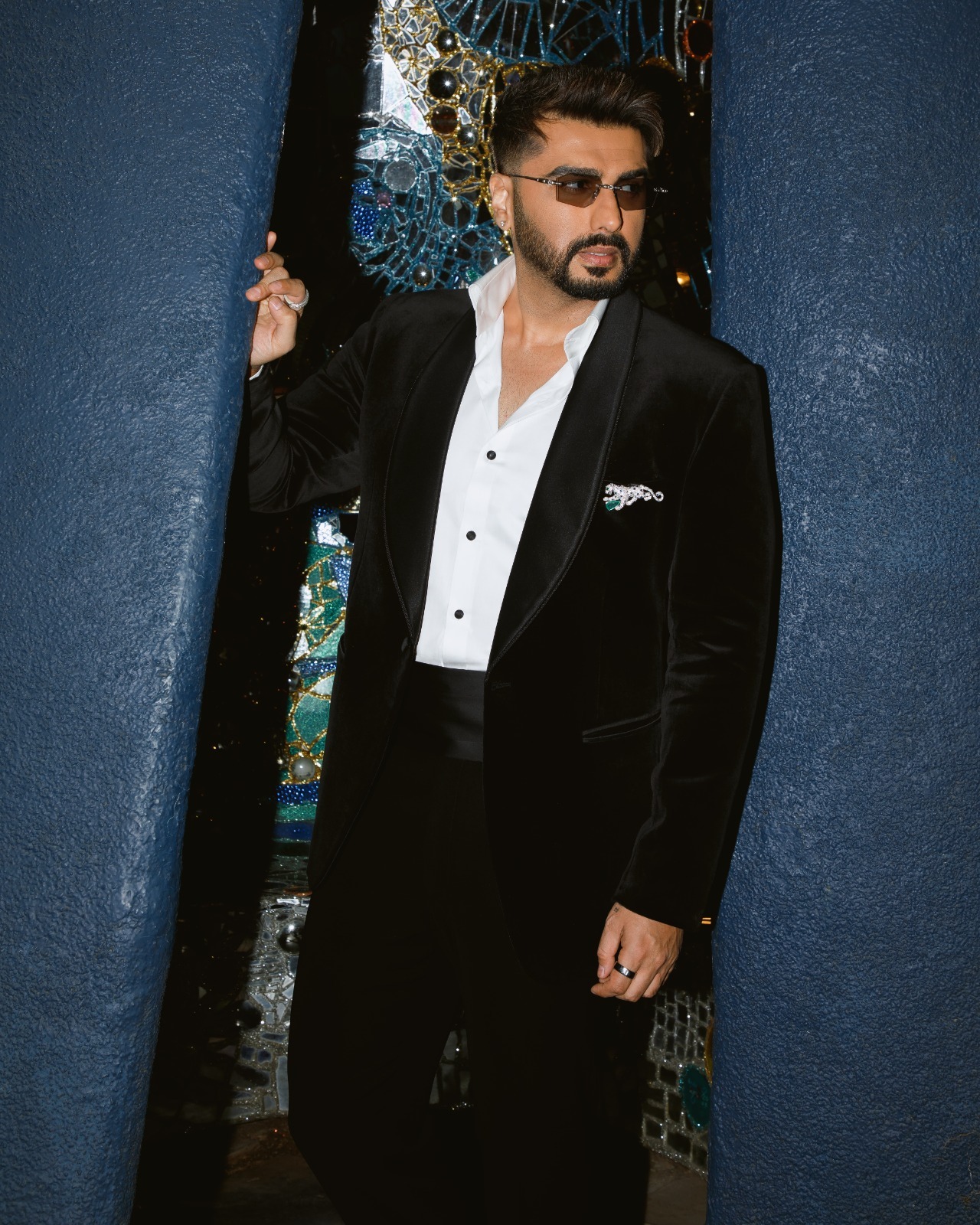 In a sleek black velvet suit, Arjun Kapoor shows his classic style ascent, one that’s tailored, confident and has a polished edge, all indicating that he’s paying attention. He keeps the look elevated without shouting for attention, and brings the spotlight on the silver brooch and structured glasses.