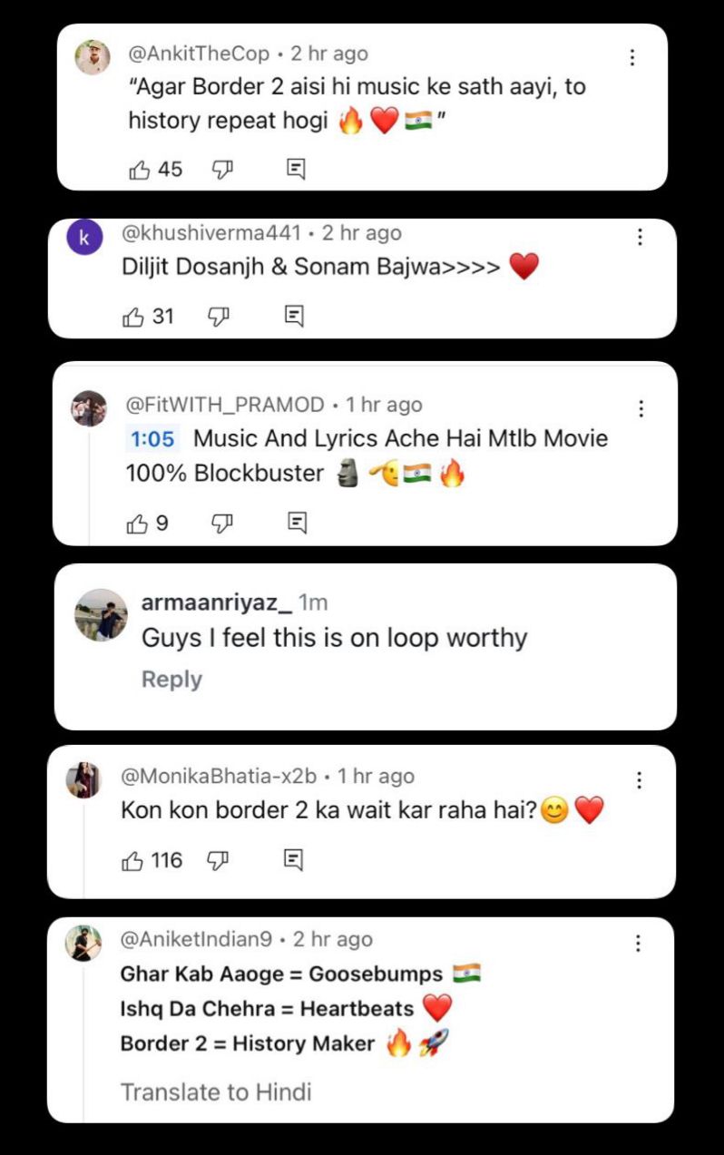 In the centre of of these praises, is the celebrated on-screen chemistry of Diljit and Sonam, where many users have commented, *“Sonam & Diljit >>> (supremacy)”* , while others praised the composition saying, *“Music aur lyrics dono hi bahut ache hai”.* Several fans are already predicting the film’s success, with comments like *“Blockbuster movie loading”* and *“Lagta hai gaane ke mamlo mein Border 2 sab ko piche chodega”.*