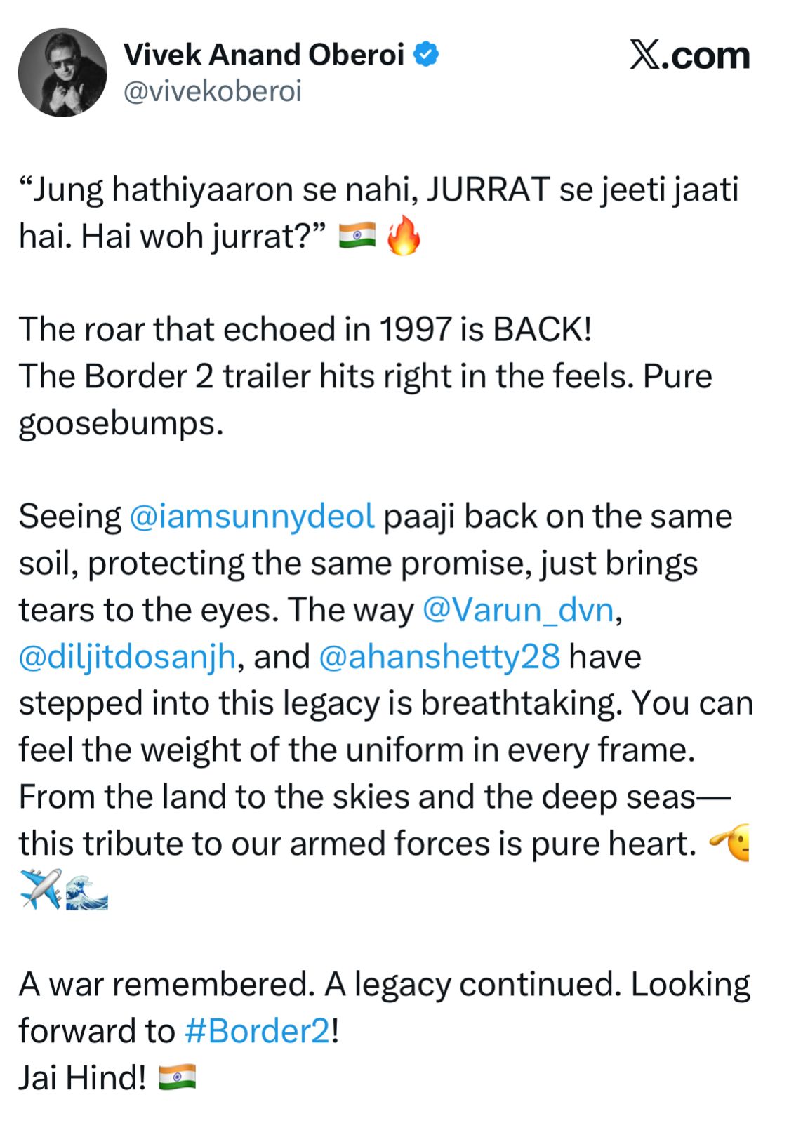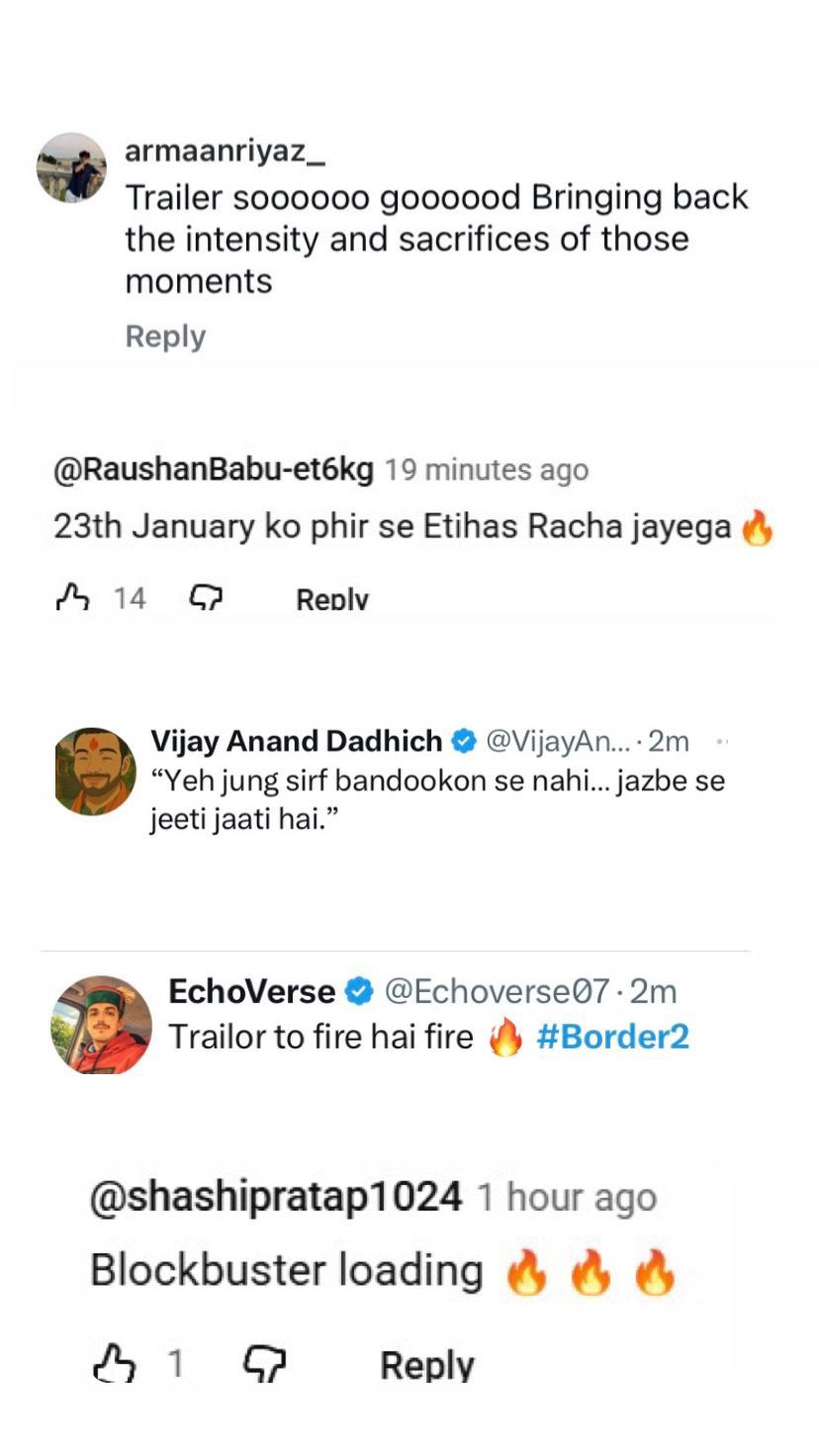 The trailer of Border 2 has struck a strong chord with audiences and the film industry alike. Since its release, the trailer has been met with an overwhelmingly positive response, sparking conversations across social media and is still trending on the platform X, drawing appreciation from several prominent voices within the entertainment industry.