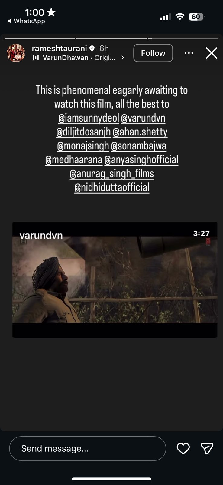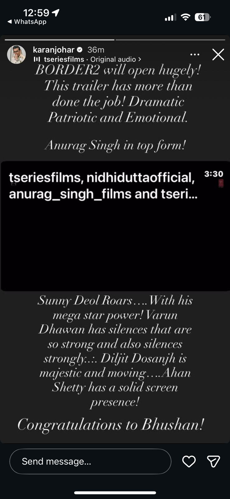 Several reactions highlighted the trailer’s emotional depth, strong visuals, and the sense of pride it evokes. While *Karan Johar* mentioned on his Instagram story, *_“Border 2 will open hugely. This trailer has more than done the job! Dramatic, patriotic and emotional. Anurag Singh in top form! Sunny Deol roars with his mega power. Varun Dhawan has silences that are so strong and also silences strongly… Diljit Dosanjh is majestic and moving. Ahan Shetty has a solid screen presence!_*, *Ameesha Patel* showed support to her Gaddar co-star Sunny Deol saying, _*“Kya baat hai TARA! No wonder Salina Ki Jaan and Hindustan Ki Shaan hai aap – Border 2 Trailer is 🔥🔥🔥🔥”_*