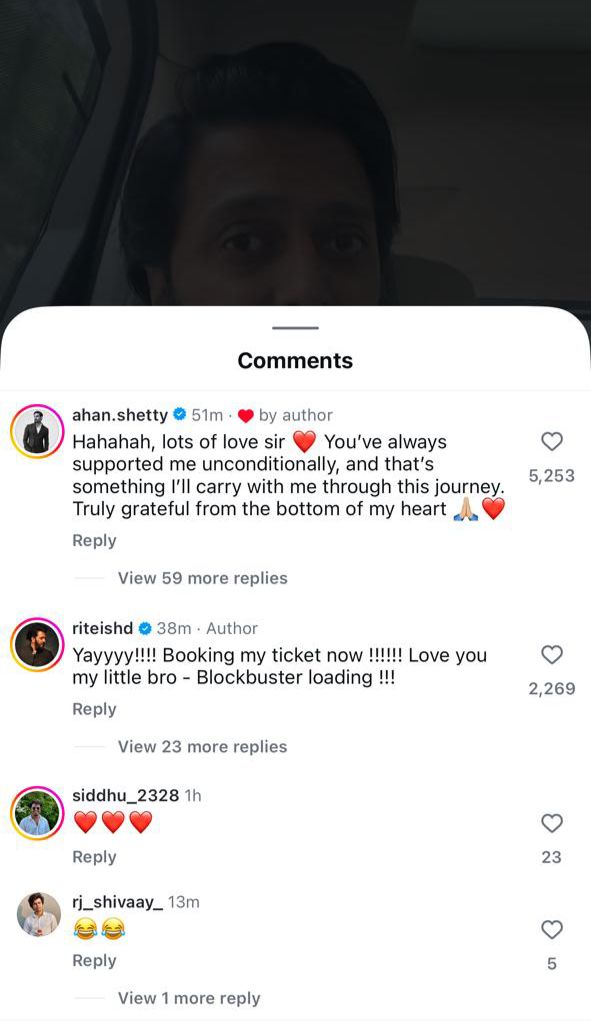 The excitement around Border 2 is everywhere, and adding to the growing buzz, *Riteish Deshmukh* was recently seen joining the viral Instagram trend around *Ahan Shetty* that has everyone’s attention on social media. The actor shared a funny reel playfully stating that he would only book his ticket to watch Border 2 once Ahan Shetty commented on his post. Taking to his Instagram, Riteish said, “Waiting for Ahan Shetty to comment on my reel – so I can book my ticket to watch Border 2 – jaldi comment karo – I am dying to watch the film”. The light-hearted moment was met with a heartfelt response from Ahan Shetty, who replied, “Hahaha, lots of love sir. You’ve always supported me unconditionally, and that is something I’ll carry with me through this journey. Truly grateful from the bottom of my heart.”
