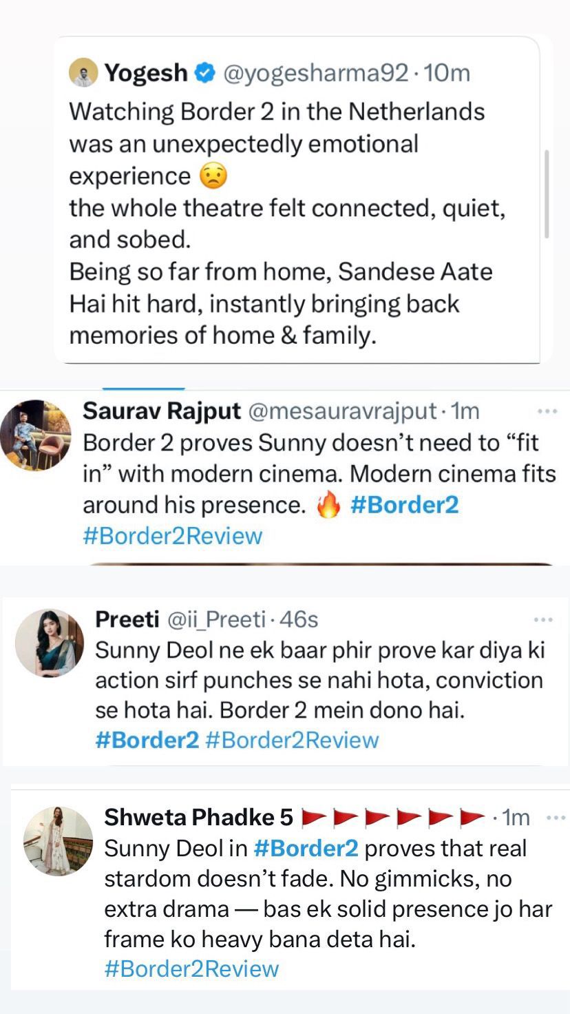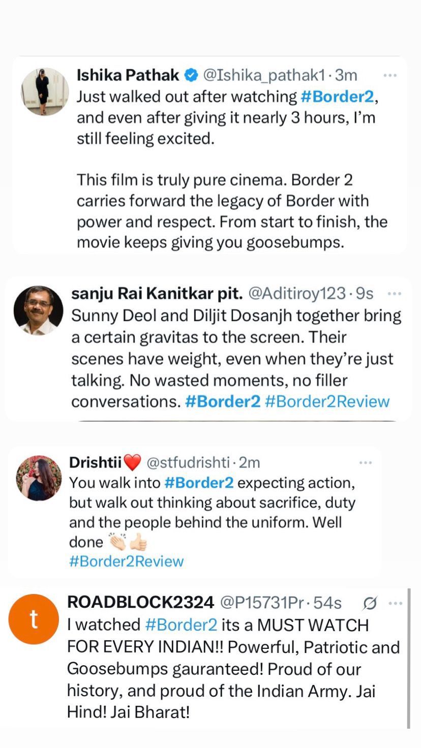 Another viewer shared, *“Watching #Border2 and even after giving it 3 hours, I’m still feeling excited,”* capturing the lasting impact the film is leaving on audiences even after the credits roll. Voicing out every proud India’s opinion, a netizen has also commented, *”A must watch for every Indian! Powerful, patriotic and goosebumps guaranteed! Proud of our history and proud of the Indian Army. Jai Hind! Jai Bharat!”*