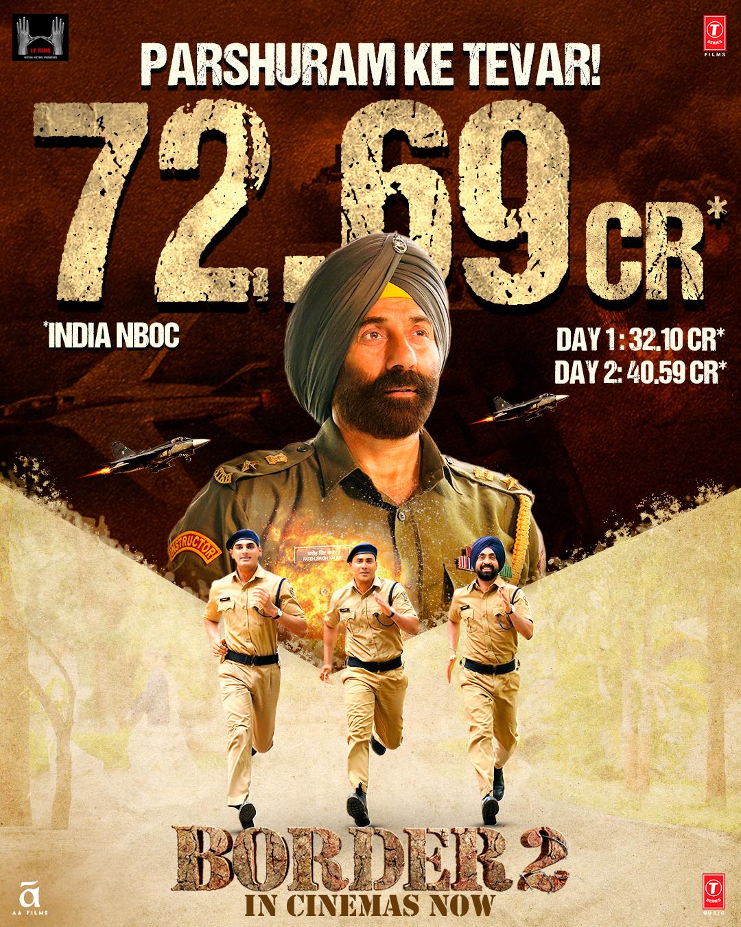 After a thunderous Day 1 opening, Border 2 witnessed a solid upward surge on Day 2, reinforcing its commanding presence at the box office with a whooping ₹40.59 CR NBOC, bringing the *total box office collection to ₹ 72.69 CR NOC* as of just two days. On its second day, the film recorded a notable rise, clearly indicating growing word-of-mouth and the beginning of a blockbuster Republic Day weekend. Defying the odds of being released on a non-holiday, Border 2 has performed consistently well across metros and smaller centres, with distributors being optimistic about a further escalation on Sunday and Monday owing to the long weekend for Republic Day.