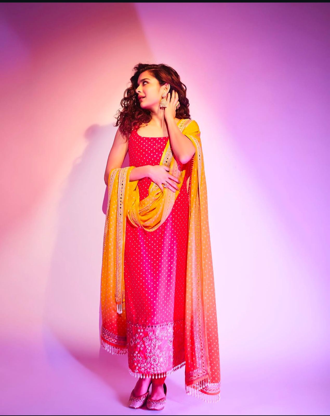 Mithila Palkar looks radiant in a bright pink kurta set, adding contrast with an ombre dupatta. She completes her look with statement jhumkas and mojaris for a perfect festive touch.