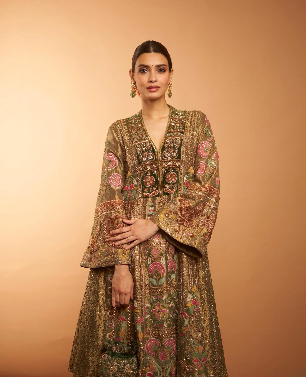 Diana Penty shows how to slay a Pakistani-style outfit, adorned with intricate embellishments and detailed motifs. She styles her hair in a neat bun, accessorizes with drop earrings, and lets the ensemble take center stage.