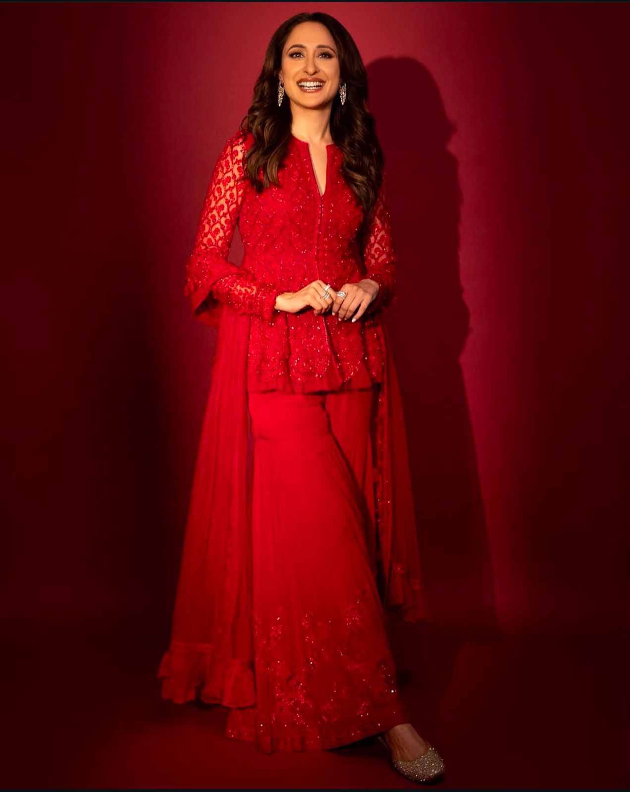 Pragya Jaiswal shows how to make a bold statement in a heavily embroidered red outfit with flared pants. She keeps her jewelry simple, letting her outfit do the talking.