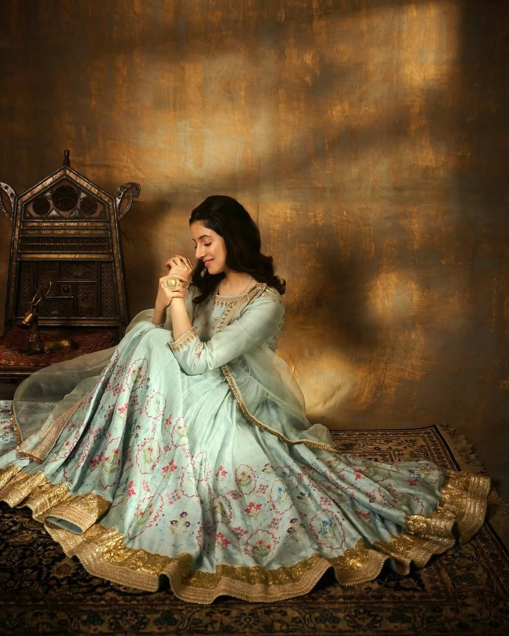 Divya Khossla exudes regal charm in a light blue Anarkali set, detailed with golden borders and floral patterns. She keeps her look simple yet impactful with minimalist jewelry, letting the outfit shine.