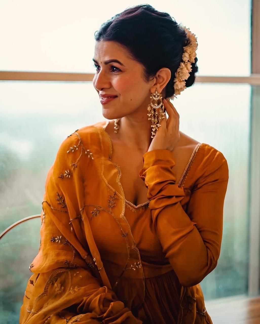 Nimrat Kaur oozes elegance in a mustard yellow Anarkali set, demonstrating how to make an effortless statement. She adorns her hair with gajras and opts for statement jewelry to complete the look.