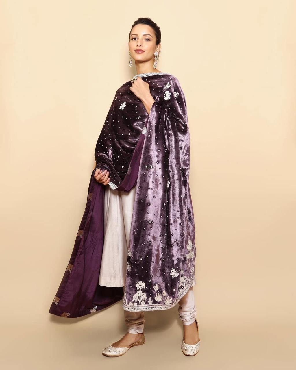 Triptii Dimri stuns in a light purple Anarkali suit, adding a bold contrast with a deep purple velvet dupatta. She accessorizes with heavy drop earrings, allowing her outfit to make a statement.