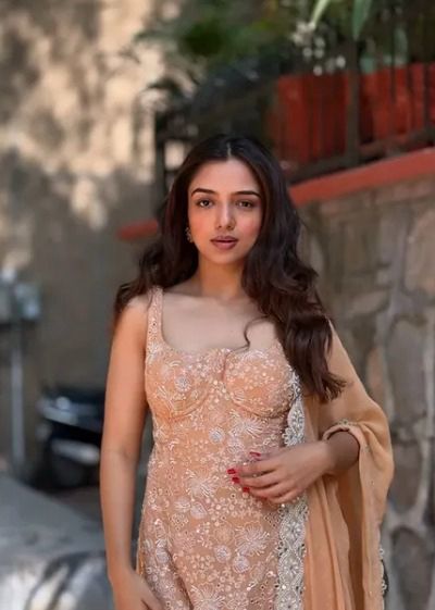 Radhikka Madan channels the Eid ka chand look in an embellished pastel gharara. She layers her outfit with kundan jewelry and enhances her look with dewy makeup.