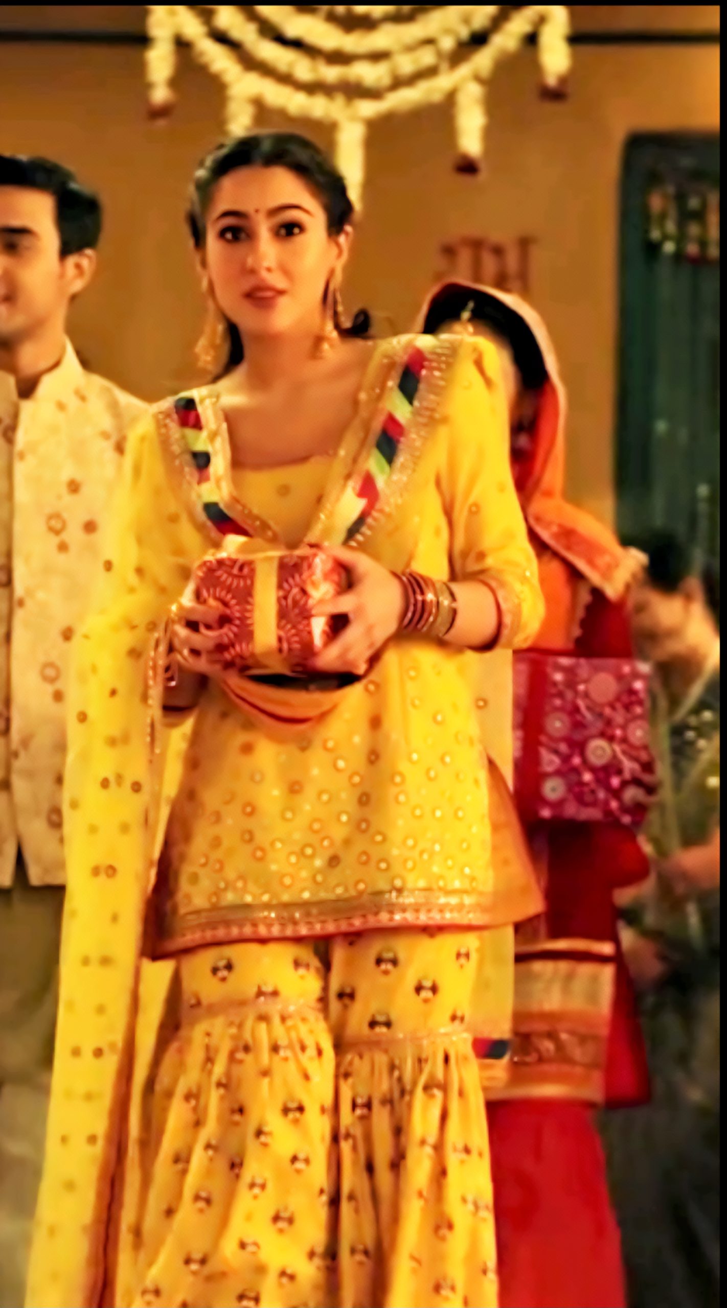 In Kedarnath, Sara Ali Khan’s yellow sharara look became an iconic on-screen moment, radiating warmth and vibrancy that matched her character Mukku’s spirited personality. The bright hue, traditional silhouette, and minimal accessories created a timeless, graceful appeal. This outfit beautifully reflected the film’s cultural backdrop while highlighting Sara’s natural charm, making it a standout style inspiration for festive and traditional occasions.